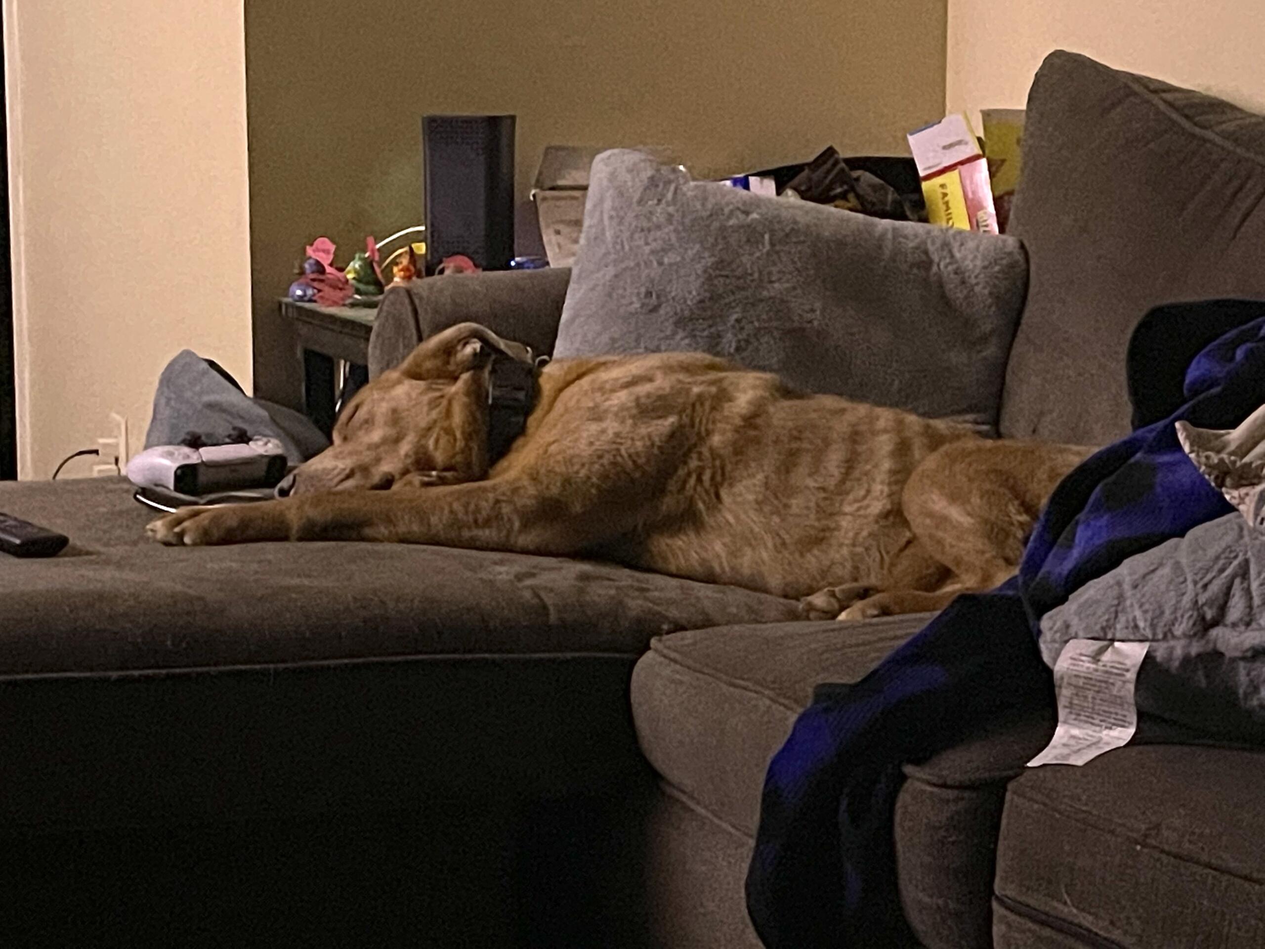 With the homecoming, the Joys now have five dogs. Sam regained a spot on the couch.