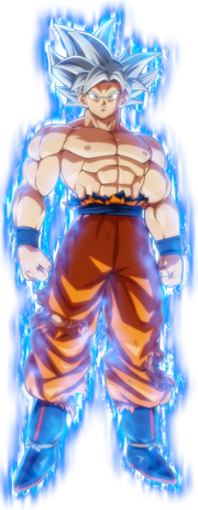 In the anime, the intensity of Perfected Ultra Instinct Goku's ability was so great that his shirt was completely shredded when it activated. In addition to this course's vast levels of power, it retains its strengthening event on Goku's Saiyan Ability power, allowing his speed, power, general efficiency, and ki to increase as he continues to fight an equally or even more powerful opponent. Its almost notable trait is that it grants Goku complete mastery over Ultra Instinct, making all of his moves automatic and able to both defend and counterattack with ease, without existence hindered by the thoughts that previously made Goku'due south use of Ultra Instinct imperfect, as Goku had let go of all of his doubts and live in the moment to fully understand Whis' teachings; thus allowing him to access the full potential of his fighting ability. Despite being a form that acts on neutral impulse, it can nonetheless aqueduct his rage to amplify its power to staggering new levels, as shown when Goku's initial stalemate against the limit-breaking Jiren became a crushing assault that apace pummeled Jiren into submission after Goku was infuriated at Jiren's shameless set on on the spectators. He also displayed such vast ki command that he could calmly repel and contain whatever energy assault thrown at him.